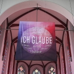 Vor einem violetten Farbverlauf zeichnet sich darauf eine Weltkugel ab. Sie umfasst die Anfangsworte des Glaubensbekenntnisses, „Ich glaube“, die auf Deutsch und in 13 weiteren Sprachen formuliert sind. „Damit wird die Vielfalt unserer internationalen Gemeindemitglieder sichtbar und zugleich betont, was alle verbindet: der gemeinsame Glaube“, sagt Hermine Baur-Ihle von der Stadtkirche Heilbronn.