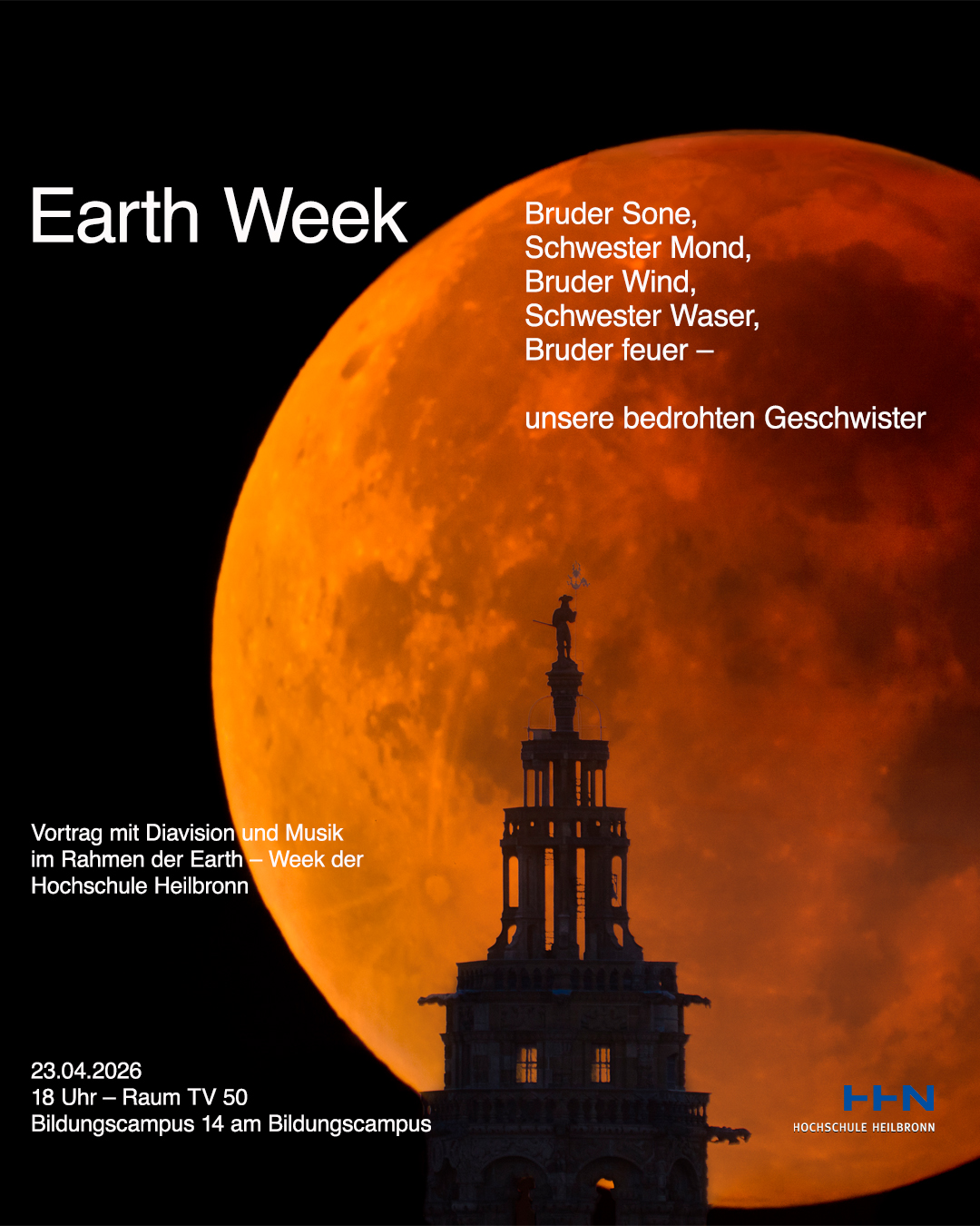 Im Rahmen der Earth-Week, welche die Hochschule Heilbronn vom 20. bis 24. April 2026 veranstaltet, bietet Hochschulseelsorger Michael Dieterle am Donnerstag, 23. April um 18:00 Uhr einen Vortragsabend an unter dem Thema: „Bruder Sonne, Schwester Mond, Bruder Wind, Schwester Wasser, Bruder Feuer – unsere bedrohten Geschwister“. Mitgestaltet wird dieser Abend von Roland Schweizer, der den Vortrag mit seinen Naturfotografien als Diavision bereichert. Ein Gitarrist rundet den Gesamteindruck durch seine Musikstücke ab.