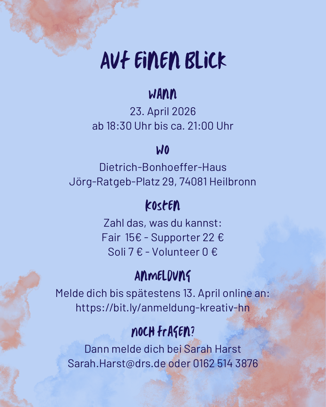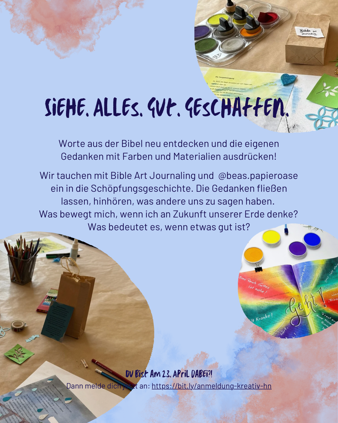 Wir laden Dich ein zu unserem neuen Angebot, dass Dir eine Auszeit im Alltag bieten möchte. Du kannst dabei mit anderen (kreativ) sein, ins Gespräch kommen und dir Zeit nehmen – abseits von Deadlines, To Do Listen und Leistungsdruck. Wir möchten Dir eine gemeinsame Zeit schenken, in der du ganz da sein kannst. Das kreative Werkeln kann Dir dabei helfen – auch dann, wenn du bei Kunst eher zwei linke Hände hast.