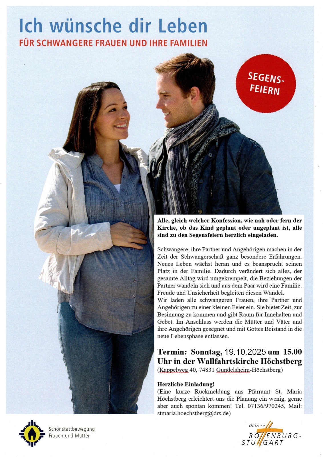 Unter dem Titel „Ich wünsche dir Leben“ laden wir alle schwangeren Frauen, ihre Partner und Angehörigen zu einer kleinen Feier ein. Sie bietet Zeit, zur Besinnung zu kommen und gibt Raum für Innehalten und Gebet. Im Anschluss werden die Mütter und Väter und ihre Angehörigen gesegnet und mit Gottes Beistand in die neue Lebensphase entlassen.