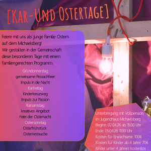 Feiere mit uns als junge Familie auf dem Michaelsberg von Gründonnerstag bis Ostersonntag! Wir gestalten in der Gemeinschaft diese besonderen Tage. Da wird viel Platz sein für spirituelle Momente, das Erleben deiner Gottesbeziehung, die Auseinandersetzung mit der Leidens- und Auferstehungsgeschichte Jesu, gemeinsame Gottesdienste (Karfreitag und Osternacht), verschiedene Workshops, einen Kinderkreuzweg, gutes Essen und Lebendigkeit!