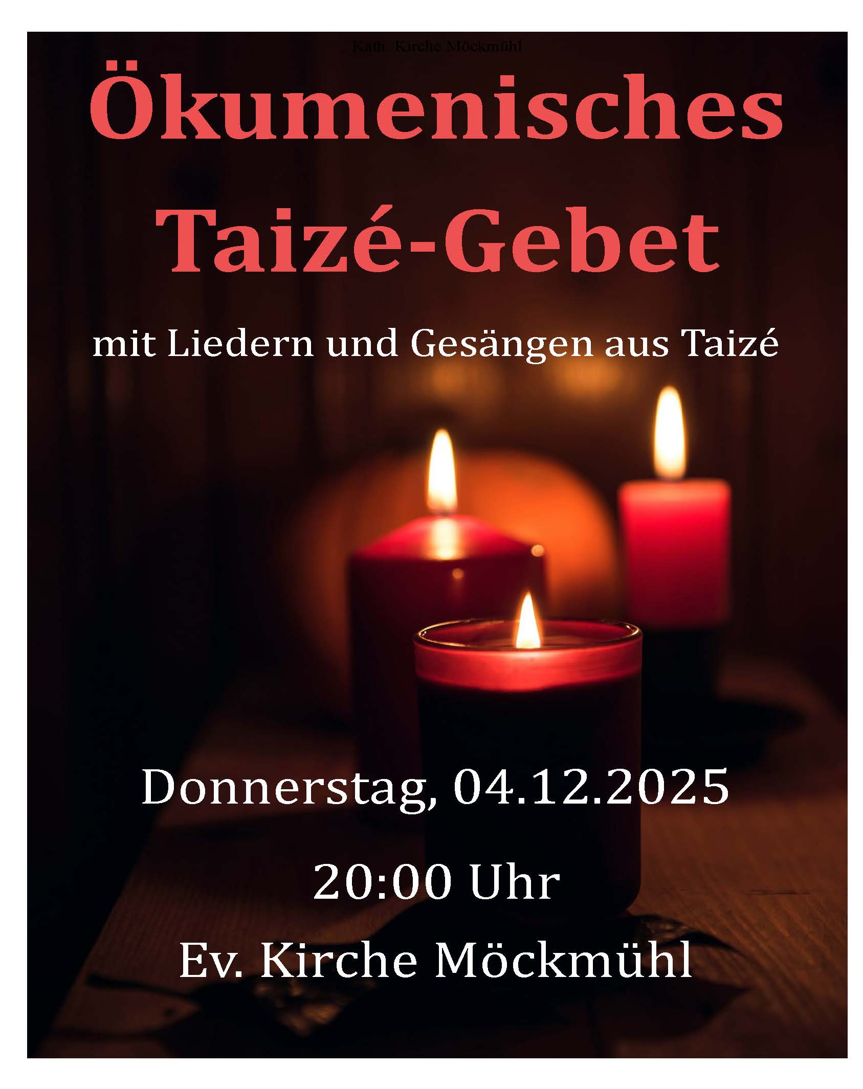 Das ökumenische Taizé-Gebet findet am Donnerstag, 4. Dezember um 20.00 Uhr in der evangelischen Kirche Möckmühl statt.
